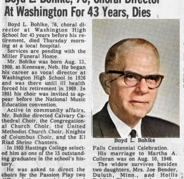 June 16, Sun City Arizona. Long-time drama coach and theatre director (1945-1972). His sense of humor was legend. He wrote a history of theatre at WHS, entitled “Theatre in Spite of Itself”. Barney was well known for his "theatre in the round" plays at WHS.